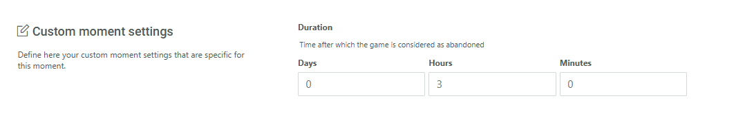 Example: At 14h, a customer starts playing a game. An hour later the game has not been completed and no updates have been made on the game. The Game Abandon Moment is triggered.