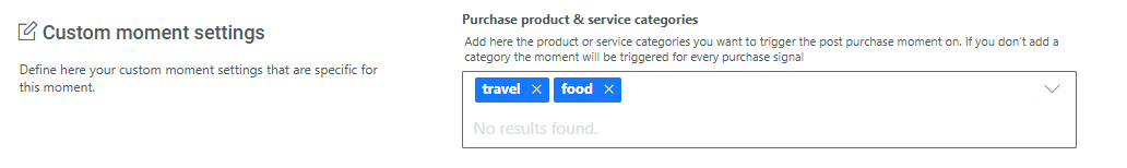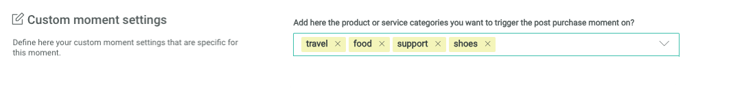 You can enter the product or service categories here, manually or by copy pasting them from somewhere else (spaces between the categories are required). This ensure the Moment will only pick up purchase signals for the defined categories and will not create a Moment for a category that is not mentioned in the list.