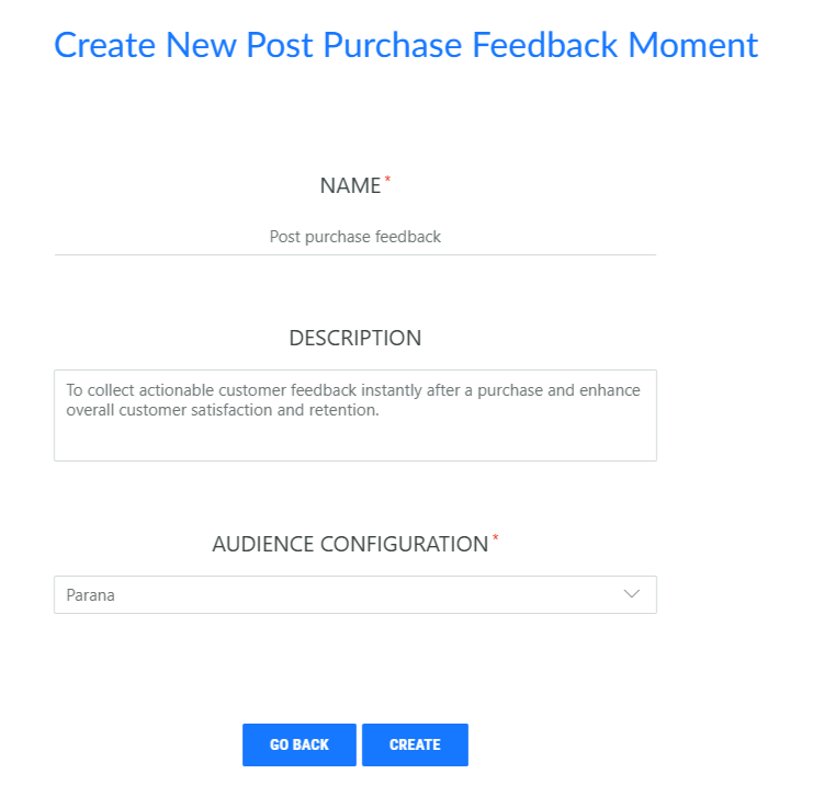 First create the Post Purchase Feedback Moment and fill out the name, description and select the Audience Configuration to apply to this Moment.