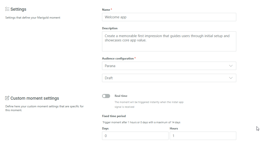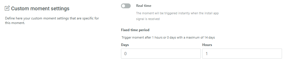 Fixed time period — Set the time delay, in days or hours, after the app installation when a message needs to be sent. Default is 1 hour. This option is only available when Real time has been toggled off.