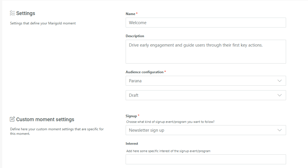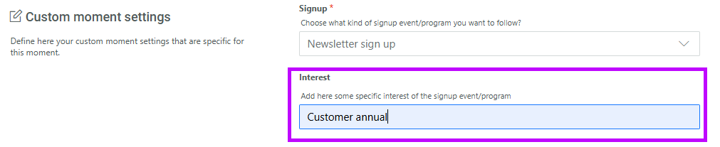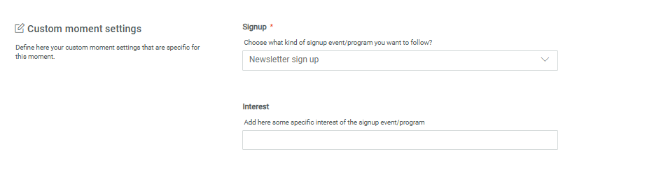 You can choose from Newsletter sign up, Webinar sign up, Event sign up, Game registration, Website registration and Sign up for a loyalty program. This implies that the Moment will only listen to signals of that specific type.