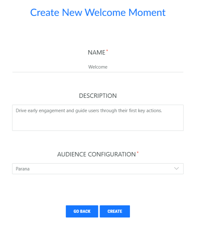 First create the Welcome Moment and fill out the name, description and select the Audience Configuration to apply to this Moment.