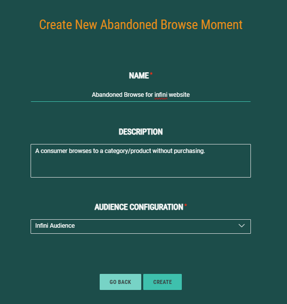 First create the Abandoned Browse Moment and fill out the name, description and select the Audience Configuration to apply to this Moment.![]()
