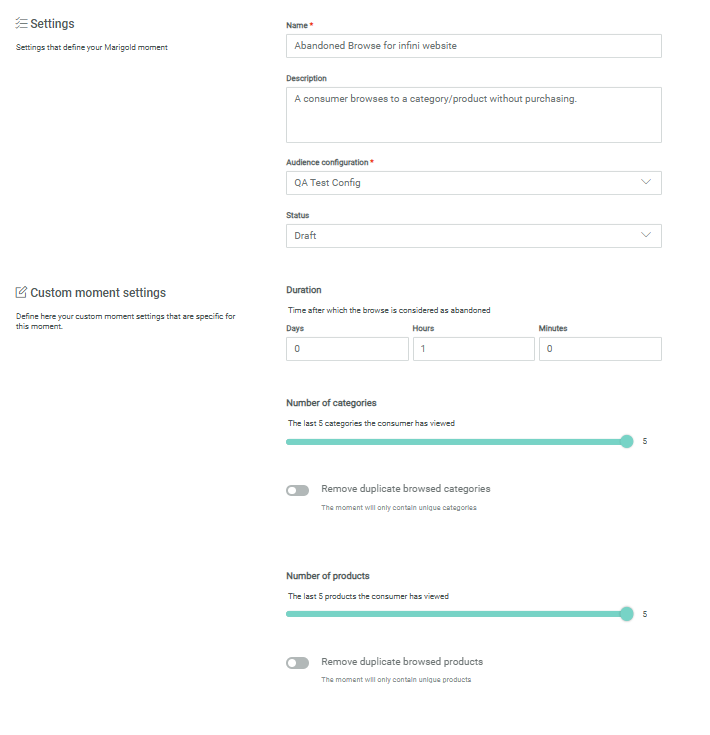 When configuring a Browse Abandon Moment, the following template specific properties need to be set (Check out the topic on creating a Moment for more details.):