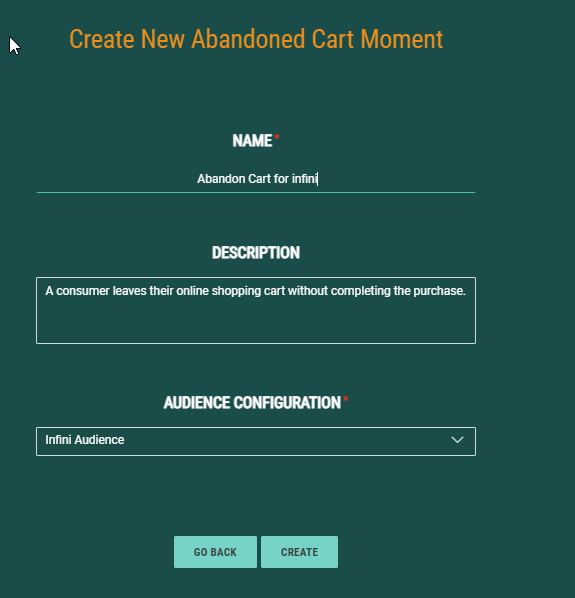 Define first the Cart Abandon Moment. Give it a name and description and select the Audience configuration that applies to this Moment.![]()