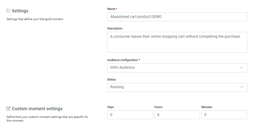 For an Abandon Cart Moment, a time delay needs to be specified, indicating after how many days, hours or minutes the Moment is triggered, for example, after 8 hours of inactivity on the cart.