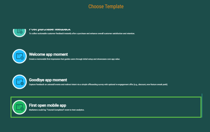 The First Open Mobile App Moment is designed to trigger real-time communications when a customer uses the app for the first time, either immediately at first use or after a defined delay. These users receive a welcome message or a tutorial that guides them through the app, helping them quickly understand its features and become comfortable using it. By supporting users at this crucial stage, you reduce the risk of early abandonment and encourage long-term engagement with your app.