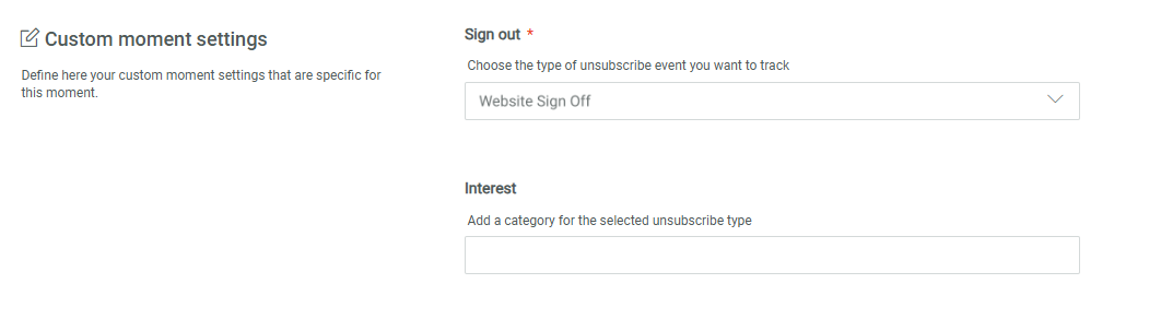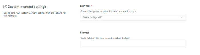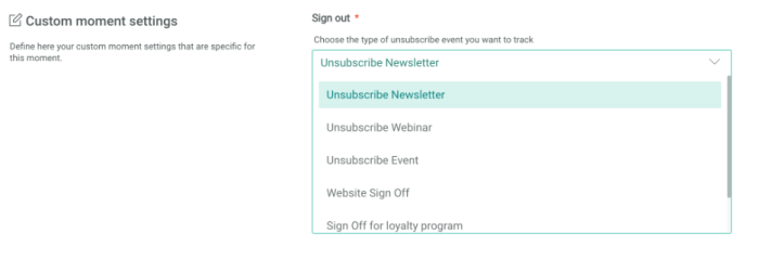 Next, you need to choose the type of Sign out event this Moment is used for. You can choose from Unsubscribe Newsletter, Unsubscribe Webinar, Unsubscribe Event, Unsubscribe Game, Website Sign off and Sign off for a loyalty program. This implies that the Moment will only listen to signals of that specific type.