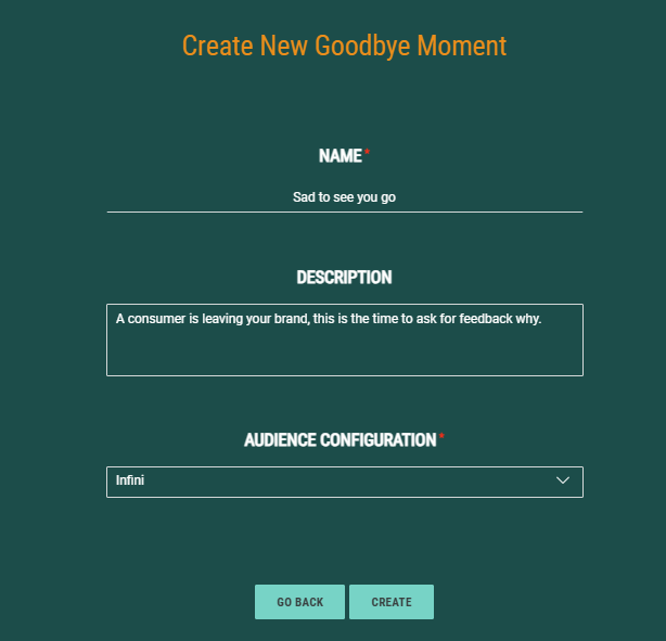 First create the Goodbye Moment and fill out the name, description and select the Audience configuration to apply to this Moment.
