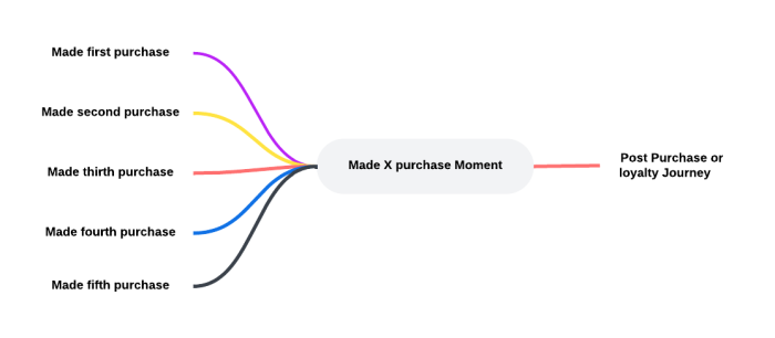 Number of purchases — This option allows you to select the number of purchases the customer has made to allow the moment to be triggered. Use the slider to choose between minimum 1 and maximum 5 purchases