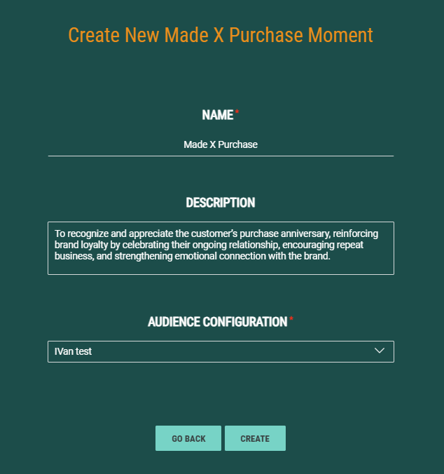 First create the Made X Purchase Moment and fill out the name, description and select the Audience Configuration to apply to this Moment.