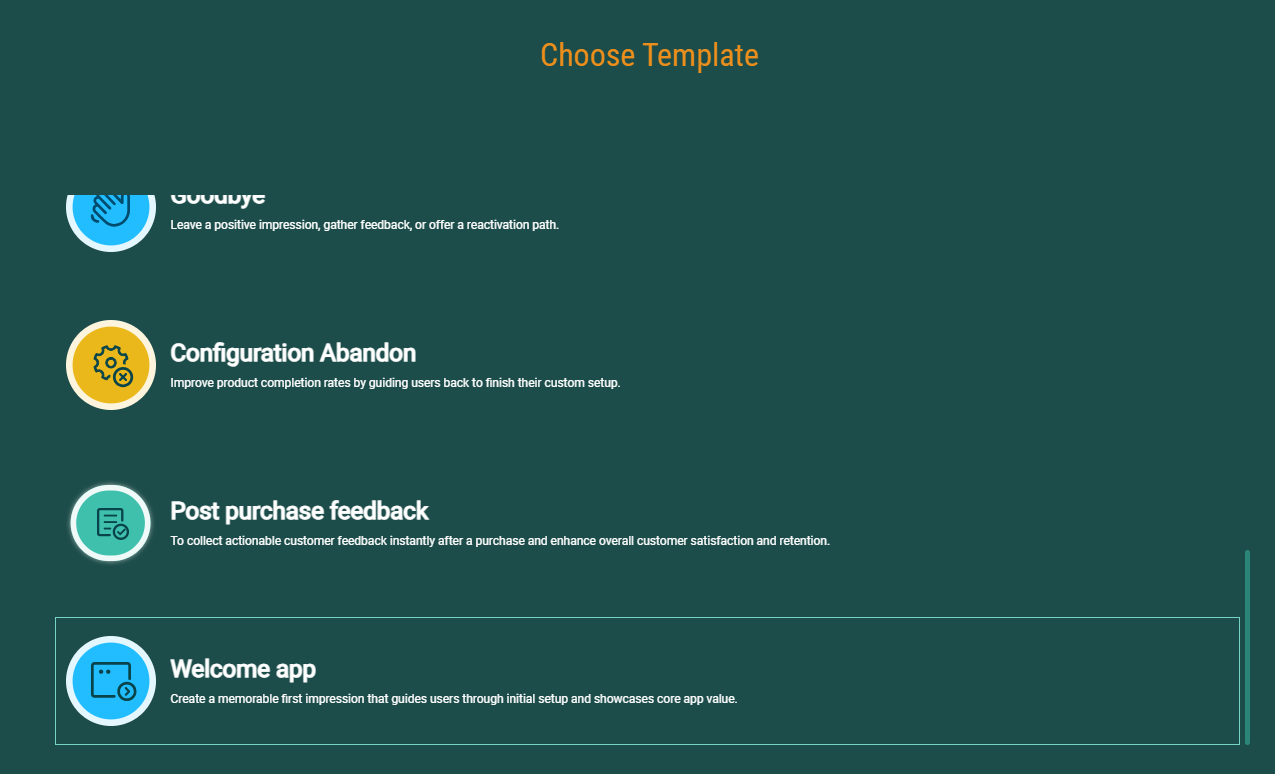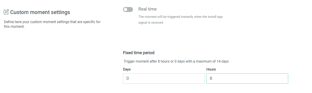 Fixed time period — Set the time delay, in days or hours, after the app installation when a message needs to be sent. Default is 1 hour. This option is only available when Real time has been toggled off.