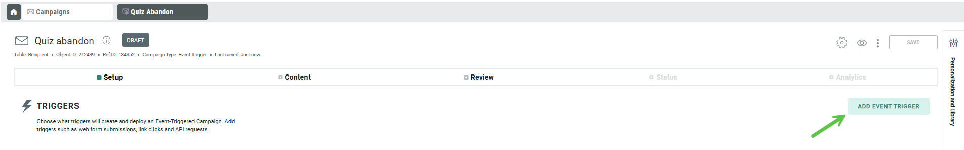 2. The email needs to be set up with Advanced Event Triggering activated to allow these messages to be personalized with data from the event. This is done on the Setup tab of the campaign: