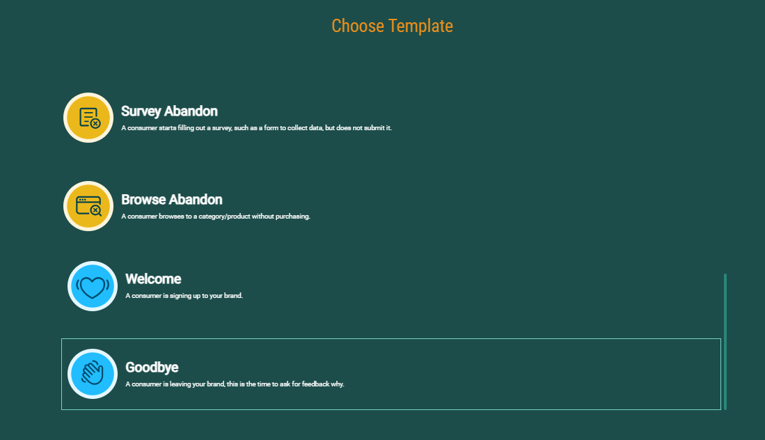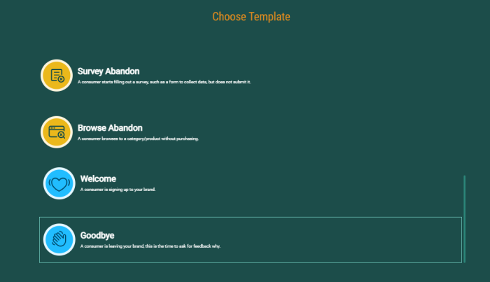 The Goodbye use case allows you to target consumers when they unsubscribe from your website, newsletter, game, etc. You can send them a sorry to see you go message or an incentive to remain a member of your community. Also, when people are leaving, it is important to get feedback on the reason why and use this information for future improvements.