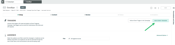 2. The email needs to be set up with Advanced Event Triggering activated to allow these messages to be personalized with data from the event. This is done on the Setup tab of the campaign: