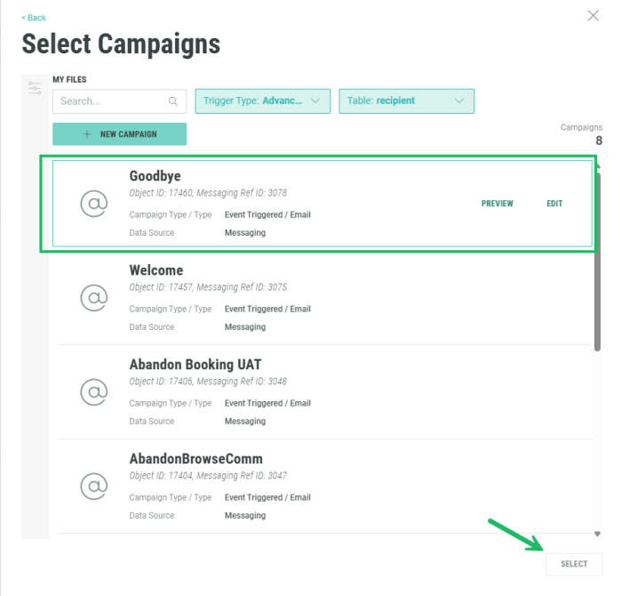 2. First, select the message (created earlier in Engage+) by clicking the Select button in the Email Campaign section.