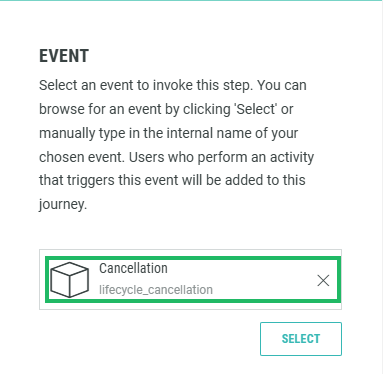 Note: By selecting this event in your journey, the journey is listening to all Moments (created in step Step 1: In Moments, create the Moment) of that specific type. When these Moments come in, the journey is triggered and communications are sent.
