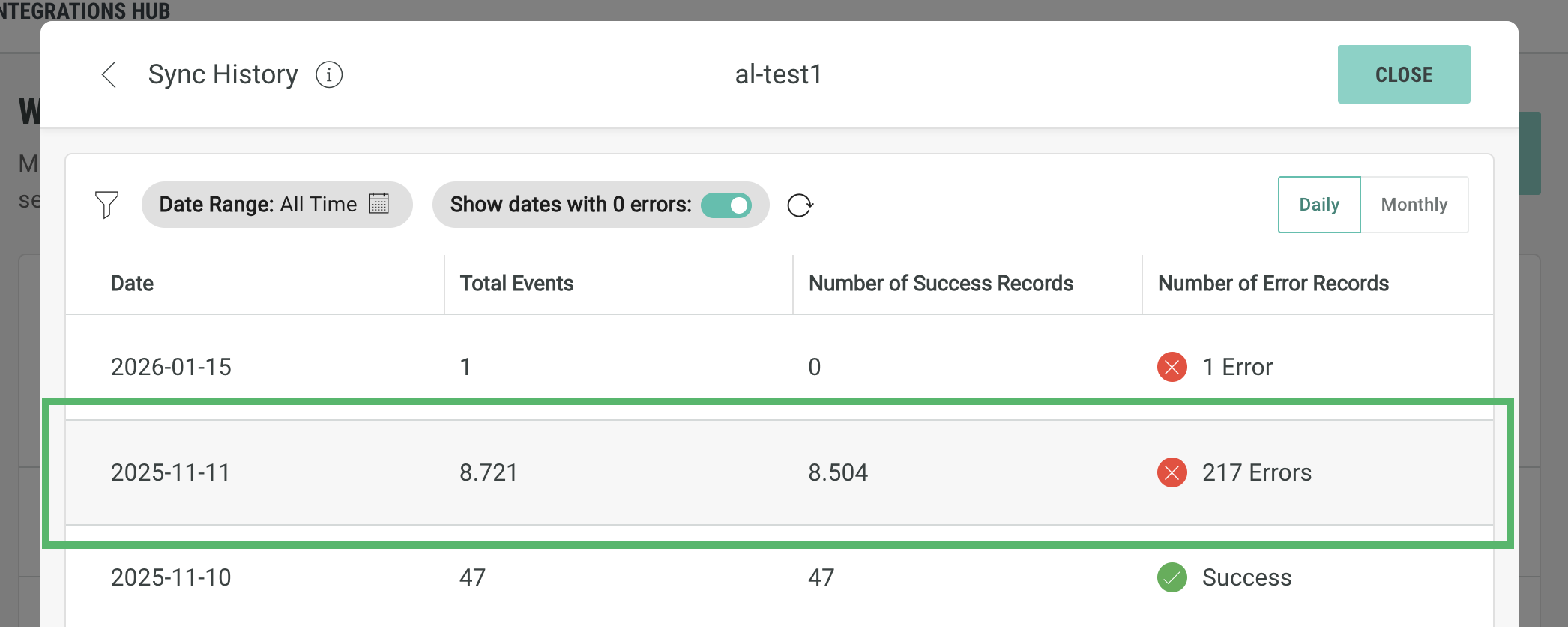 When viewing your sync history, as detailed previously, click on an entry to view the associated error logs within a new window.