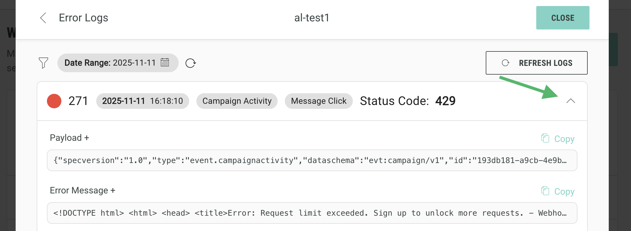 When testing or viewing the sync data for each webhook, you may come across errors.