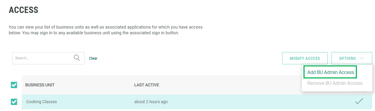 Select Options > Add BU Admin Access.