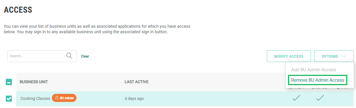 Select Options > Remove BU Admin Access.