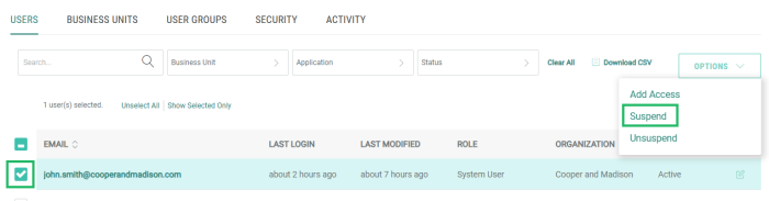 Only users with a status of Active are able to log into Marigold applications. The platform allows Organization Administrators to suspend user accounts, which sets their status to Suspended, and prevents them from logging in. Suspended user accounts can later be un-suspended, which sets their status back to Active.