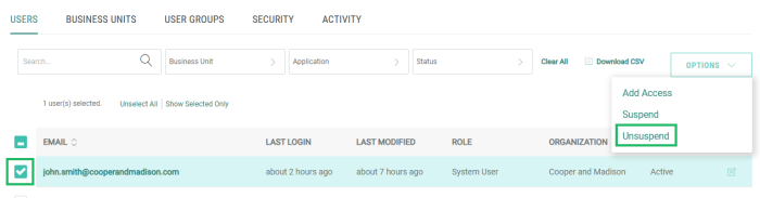 To unsuspend one or more user accounts from the Users tab in the Administration environment:
