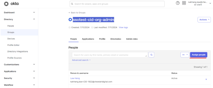 Click Assign People to assign a user to the group created above.