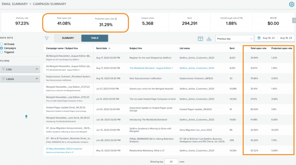 Zeta & Engage by Sailthru recommend using the Projected Open Rate to compare open performance across messages.