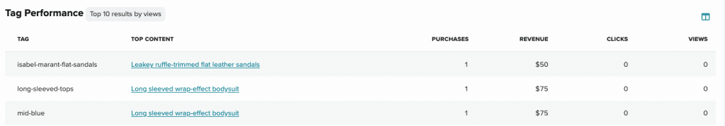 The Tag performance table provides a sum of the data for the content associated with each of the top ten performing tags based on the metric that you have selected to measure the content by, such as views, clicks, purchases, and revenue.