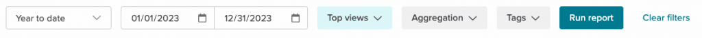 The Filter options available for Content Summary allow you to change the date ranges that the reporting pulls from, change what metric you would like to view the top performing results by, and filter by tags. You can also apply an aggregation which displays the single highest performing result per aggregation period, such as every week for the previous month.