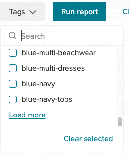 The first 100 tags by alphabetical order will display inside the Tags filter. Scroll to the bottom of the tag list and select 'Load more' to display the next 100 tags.