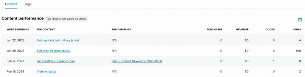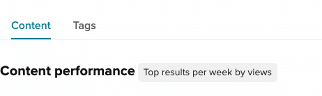 The tables section contains two tables that provide data of your top performing content and top performing tags. Access the tables by selecting the Content or Tags tab displayed below the headline and comparison metrics.