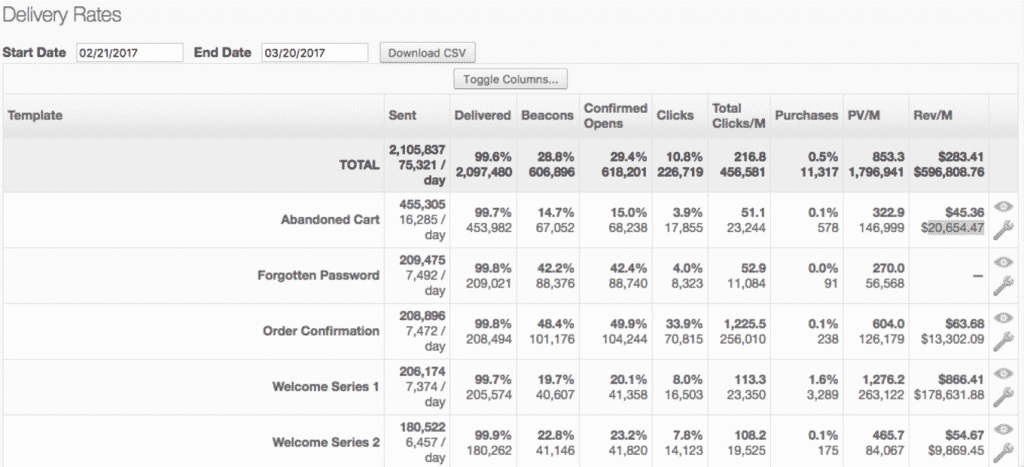 - Delivery Rates Report - Provides engagement-based reporting on triggered emails, such as Welcome or Abandoned Cart messages.
