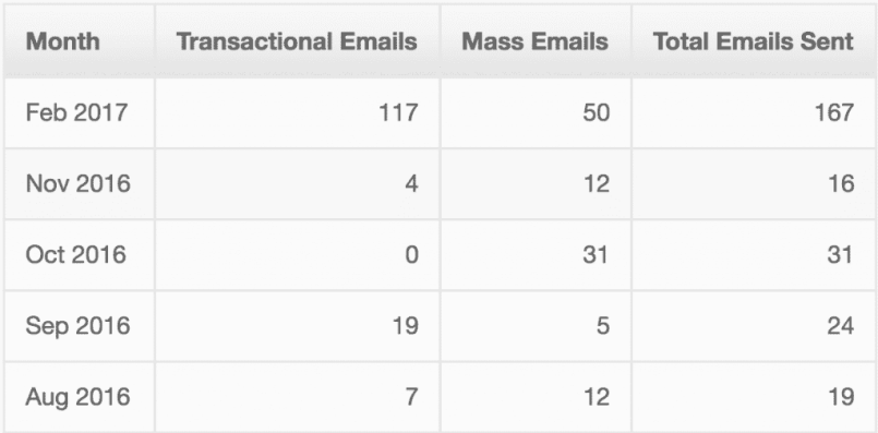 View your total sends by month for Triggered Emails, Mass Emails and Total Emails Sent.