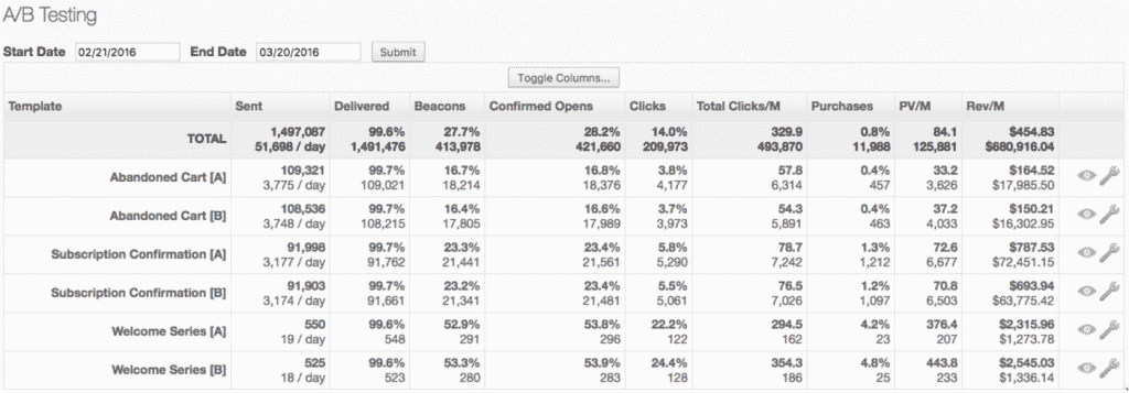 - A/B Testing - Provides side-by-side engagement-based reporting on A/B split triggered templates.