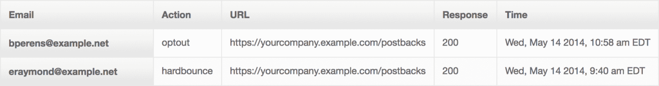 The table for this report lists the Email address of the user, theAction attributed to that user/email (including an optout from a hosted page, hardbounce, or signup verification), URL to which the data was sent, your server's Response code sent back, and Time.