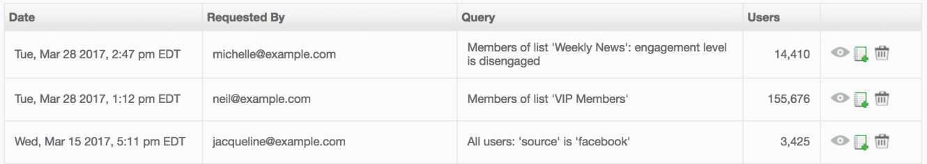 The table for this report lists the Date, who the report was Requested By, and the details of the Query. See Snapshot Reports in the Managing Lists documentation for more information.You can select the following icons on each row: