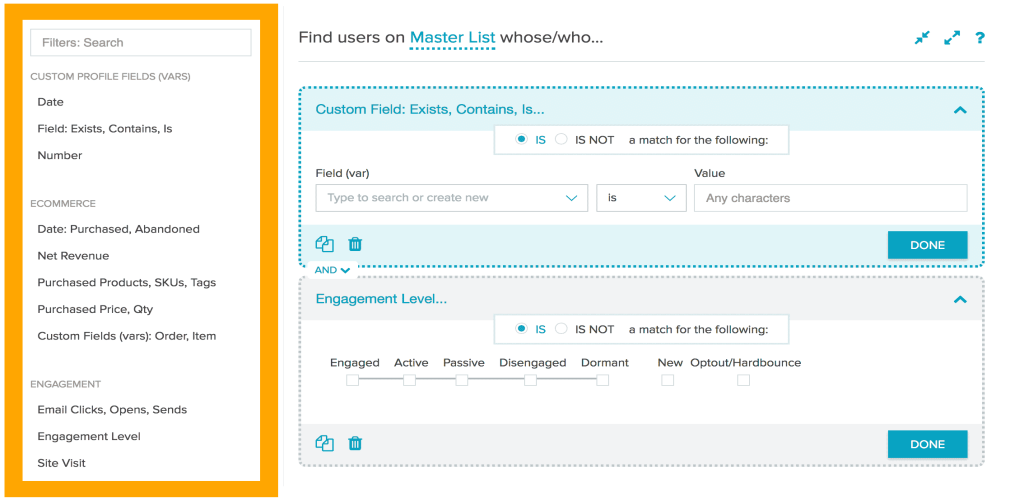 - All users in database - Use with caution. This option includes all users ever mailed, uploaded, or stored in your account via API calls such as purchase, user, or send. Not all of these users have opted in to campaign mailing, and must not be messaged without consent.