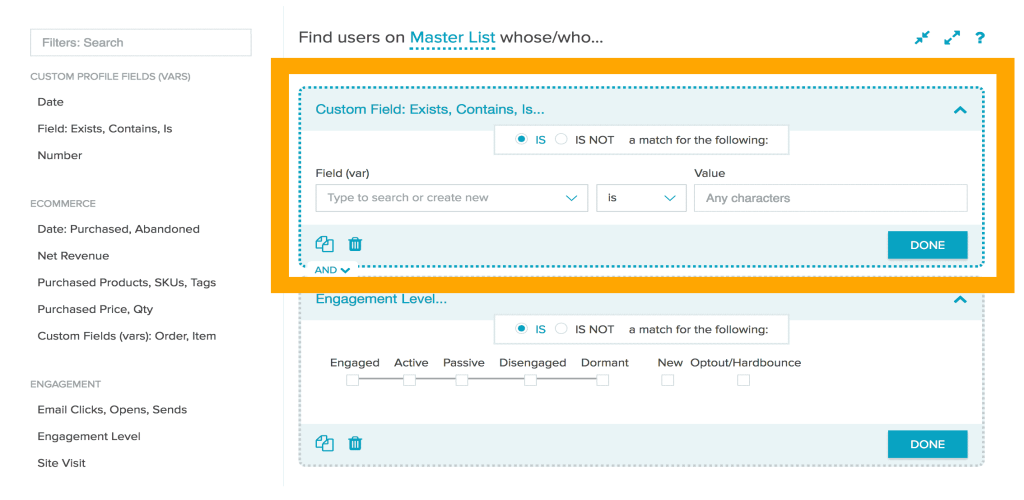 - You can add a "NOT" logical operator to a group or subgroup to exclude users who match the result of the group. Hover over the grouping bar, and click IS to change the operator to NOT.