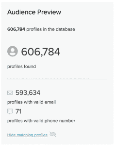 When you have selected your lists and have selected Done, Audience Builder loads. Audience Preview will load on the right side of the filter screen. It shows you how many profiles you have available in your database and how many your selected lists contain. Sample profiles load below the preview, showing both valid email addresses and valid phone numbers.