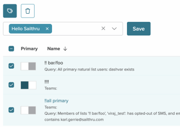 Primary lists are lists in which daily changes in list growth and engagement are tracked in Sailthru's reporting. Secondary lists are not tracked. Toggle Primary status on or off from the list entry. You can have up to 50 Primary Lists.