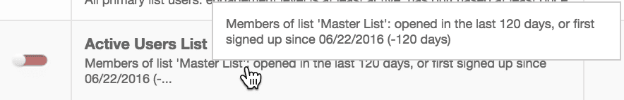 To see all the criteria and parameters that were used to generate an existing Smart List, find the Smart List in your Lists page. Below the Smart List name, the Audience Builder filter criteria that is being used to generate the Smart List is displayed. If the full criteria is too long to be displayed, hover your mouse over the list description to display it. Note that lists displayed with no criteria below their name are Natural Lists,not Smart Lists.