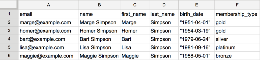 - The rest of the headers in the first row are used to set variable names (e.g. first_name, last_name, phone, postal_address).