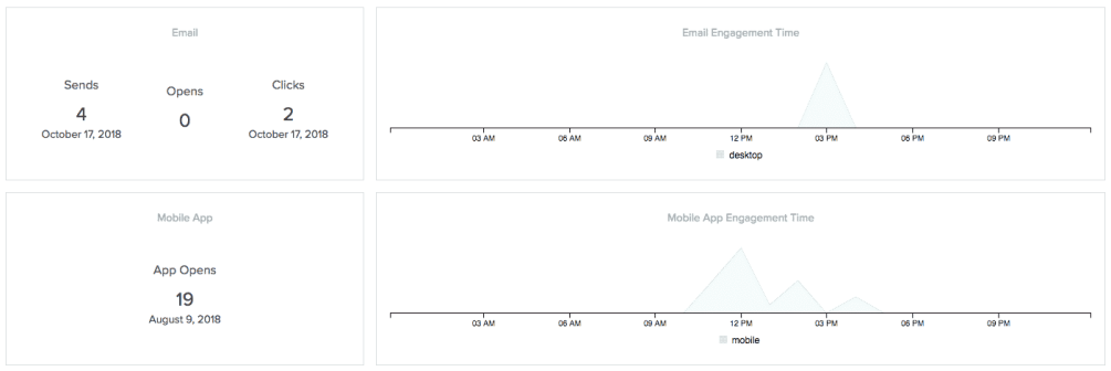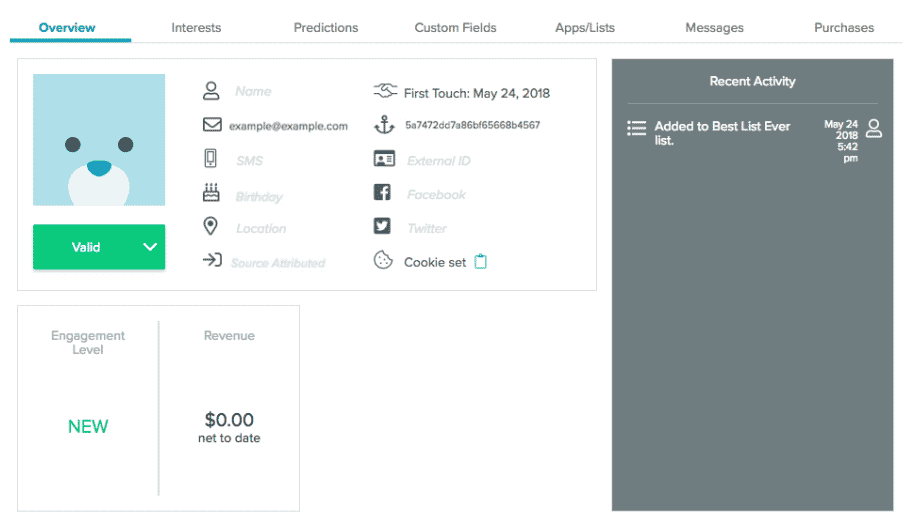 | Recent Activity | A detailed list of recent activity, including purchases, lists the user has been added to or removed from, clicks, and opens. Recent Activity is displayed in a gray box to the right of the user profile. Recent Activity will show only one message under 'Last Opened'. To see more message activity, select the Messages tab. |