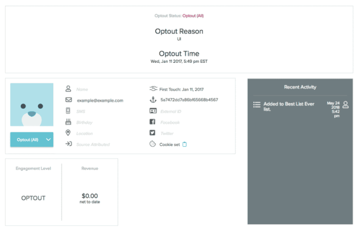 - Optout (All) The user has opted out of all messaging. This includes any transactional messaging like purchase receipts and password reset messages.