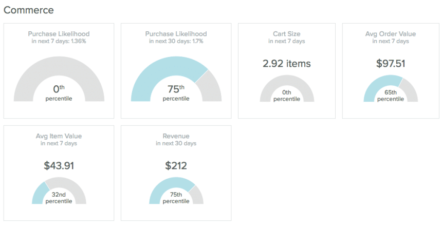 This section includes an overview of the engagement and e-commerce predictions available for an individual user. A Prediction Manager subscription is required to use this feature; see the Predictions Overview for more information.
