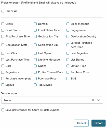 For information about each field, please see the field glossary. - If you want to default to export all fields and vars the next time you view this screen, check Save preferences for future list data exports.