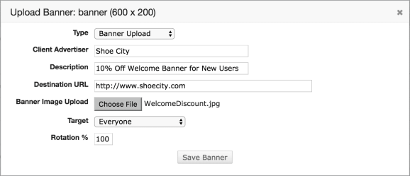 - The banner you upload must be the same size for the ad slot, noted at the of the dialog box -- 600 x 200 in the example below.