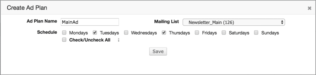 You'll need to set up at least one ad plan and a schedule for each campaign (for example, a recurring newsletter), or you can reuse an ad plan across multiple campaigns. This only takes a few minutes, and once complete, the only management necessary is the upload of new ad images.